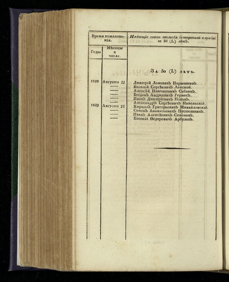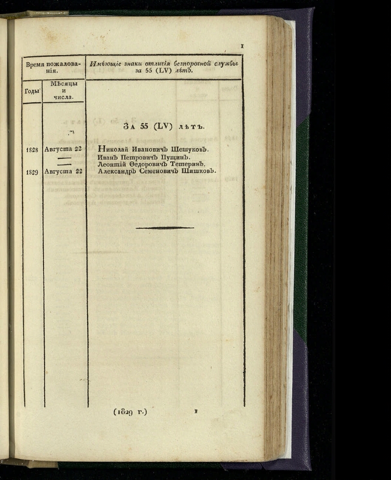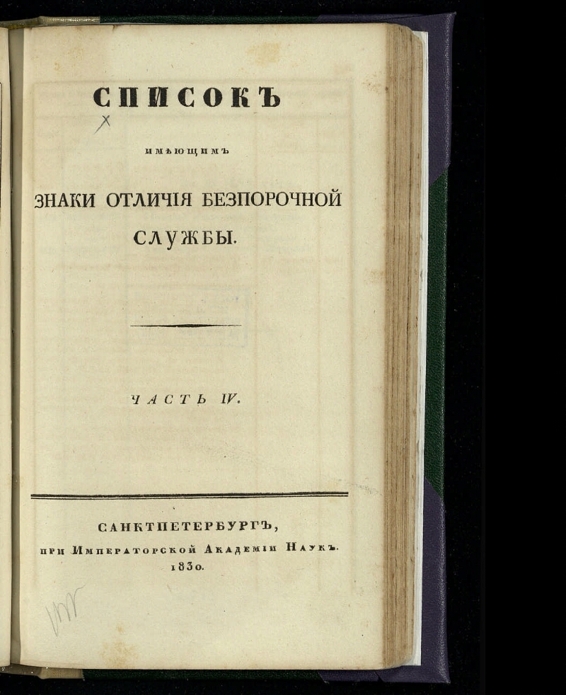 [за 1829 г.]. Ч. 4. - При Императорской Академии наук, 1830. -96, [2] с. : табл. ; 14 х 21,5 см. - На тит. л. общее загл.: Список имеющим знаки отличия беспорочной службы. Экз.: без обл.