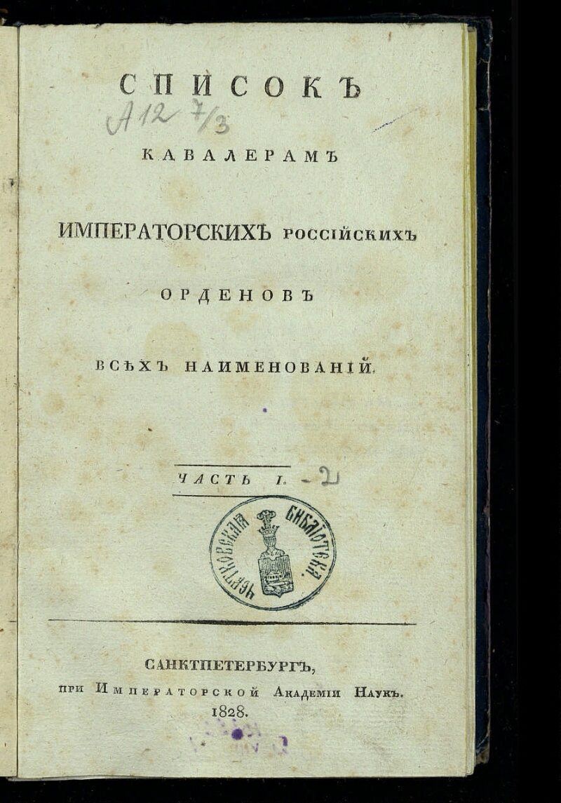Список кавалерам российских императорских и царских орденов... - Санкт-Петербург : [Б. и.], 1828-1852. - 21,5 х 14,5 см. - Загл. списков: за 1827-1829, 1831 гг. и 1932 г., ч. 1-2: Список кавалерам императорских российских орденов всех наименований; за 1832 г., ч. 3, 1838 г., ч. 1-3, 1843 г.: Список кавалерам российских императорских и царских орденов всех наименований; за 1832 г., ч. 4: Список кавалерам российских императорских и царских орденов; за 1832 г., ч. 5 и 1843 г., ч. 6: Список имеющим знаки отличия беспорочной службы; за 1833-1834 гг.: Список кавалеров всех российских императорских и царских орденов и имеющих знаки отличия беспорочной службы; за 1839-1841, 1845 гг.: Список кавалерам российских императорских и царских орденов и имеющих знаки отличия беспорочной службы.
