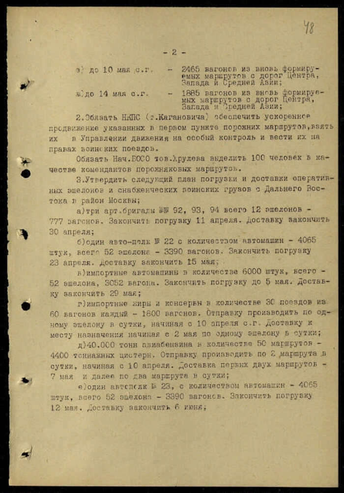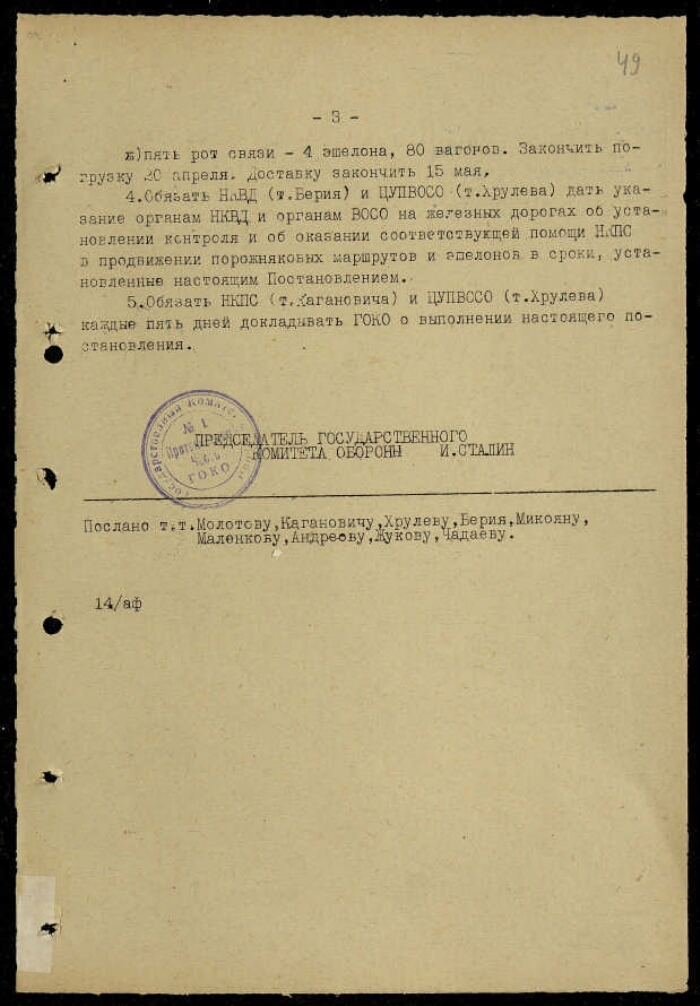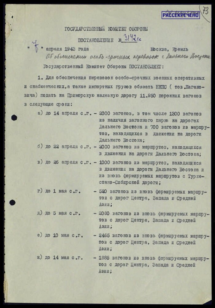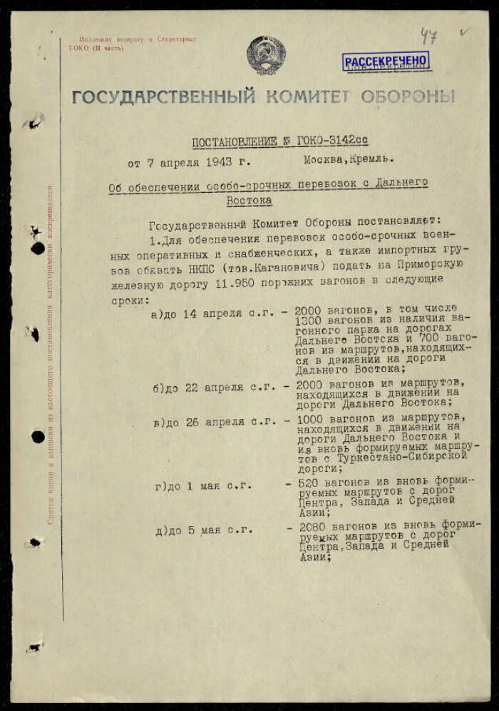 Заголовок | Постановление ГКО СССР № 3142 сс об обеспечении особо срочных перевозок с Дальнего Востока, с приложением докладной записки Кагановича Л. М., Хрулева А. В., Берии Л. П., Маленкова Г. М. Сталину И. В. |