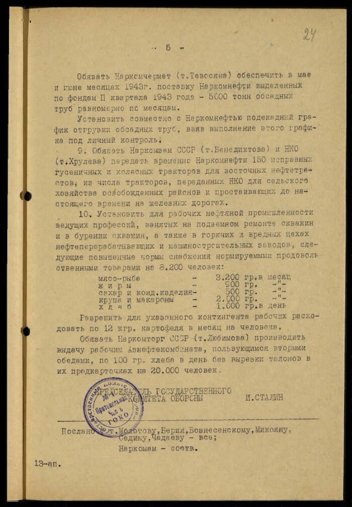 | Заголовок | Постановление ГКО СССР № 3324 сс о добыче нефти и выработке нефтепродуктов в мае 1943 г., с приложением плана завоза сырья заводам Наркомата нефтяной промышленности на май 1943 г. и с приложением докладной записки Берии Л. П., Вознесенского Н. А., Седина И. К. Сталину И. В. |