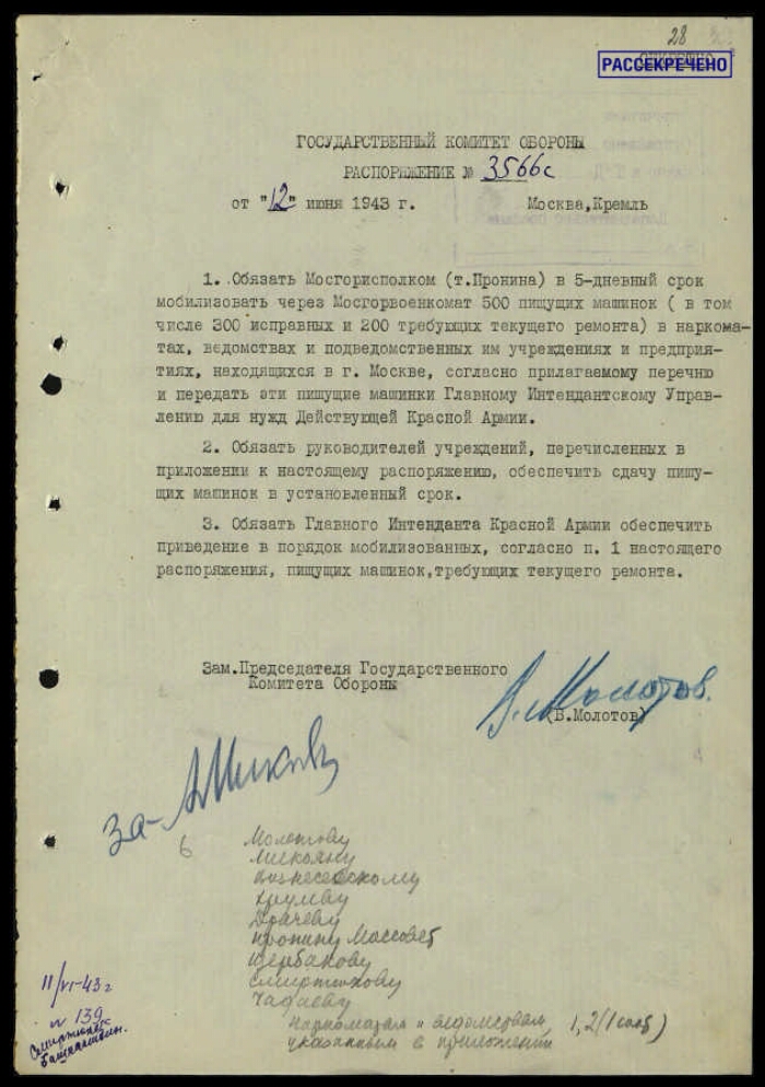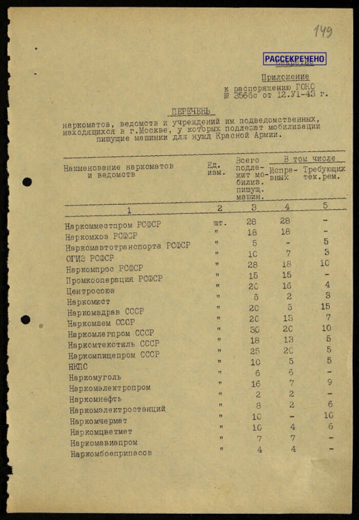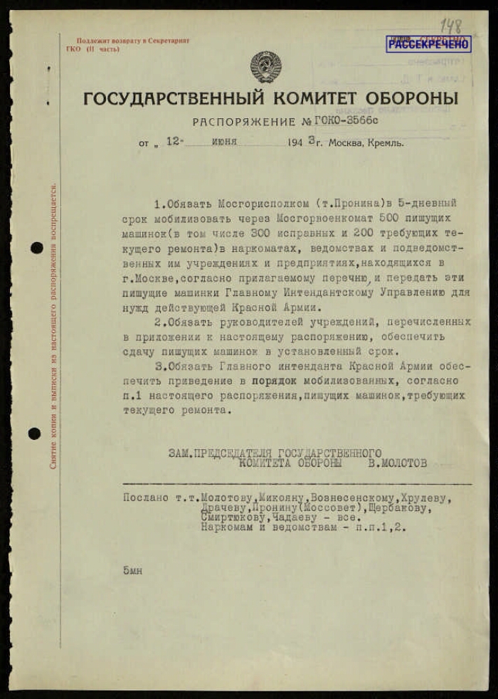 | Заголовок | Распоряжение ГКО СССР № 3566 сс о мобилизации в наркоматах, ведомствах и подведомственных им учреждениях и предприятиях, находящихся в г. Москве, пишущих машинок для нужд Красной армии, с приложением перечня наркоматов, ведомств и учреждений им подведомственных, находящихся в г. Москве, у которых подлежат мобилизации пишущие машинки для нужд Красной армии |