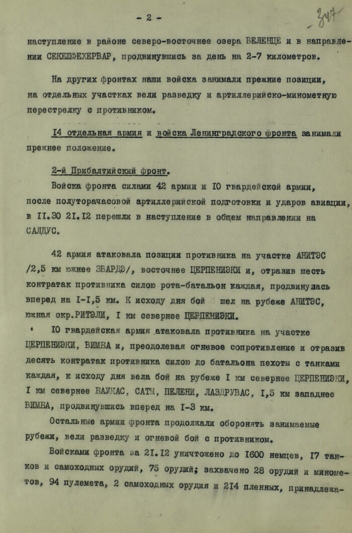 | Заголовок | Оперативная сводка Генерального штаба Красной Армии № 357 на 22 декабря 1944 г. о положении на фронтах |