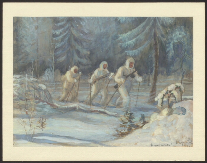 Ночной поиск : [рисунок] / художник В. А. Бунтов. - [Б. м.], 1943. -1 лист : бумага, гуашь ; 21,5х30 см. - Режим доступа: интернет-портал Президентской библиотеки . В правом нижнем углу дата "43 г." и автограф художника. Рисунок вставлен в паспарту. Электронная репродукция (1 файл, JPEG : 7,5 Мб). Копирование пользователями не разрешается. Бунтов Василий Алексеевич (1905-1979) - художник, участник Великой Отечественной войны 1941-1945 гг., автор Знамени Победы. Окончил Ленинградский художественно-промышленный техникум (1927), работал учителем черчения и рисования в школах и домах пионеров. В 1938 г. окончил двухгодичные курсы повышения квалификации работников искусств, до 1941 г. состоял в Ленинградском городском комитете художников. В период Великой Отечественной войны старший лейтенант В. А. Бунтов служил военным комиссаром 85-й отдельной автосанитарной роты, в звании гвардии капитана был заместителем командира батальона 66-го стрелкового полка 23-й гвардейской стрелковой дивизии по политчасти и начальником клуба дивизии, инструктором Дома офицеров Красной армии 3-й ударной армии. 20 апреля 1945 г. получил задание изготовить девять специальных знамен (по числу наступающих на Берлин дивизий 3-й ударной армии), каждое из которых должно быть копией Государственного флага СССР. Одному из знамен, с которым раньше остальных бойцы смогут прорваться и водрузить над Рейхстагом, суждено будет стать Знаменем Победы. В. А. Бунтов белой краской рисовал на полотнищах звезды, серп и молот, писал названия дивизий. В правом нижнем углу на знаменах были проставлены номера (от 1 до 9) и переданы в дивизии. Знаменем Победы стало знамя под номером 5, поднятое над Рейхстагом разведчиками 150-й Идрицкой ордена Кутузова 2-й степени стрелковой дивизии Михаилом Егоровым и Мелитоном Кантария. Во время войны В. А. Бунтов много рисовал, делал наброски тушью, карандашом, чернилами (портреты бойцов, военная техника на марше, сожженные деревни и разрушенные города и т. д.). Среди произведений периода войны: "Ночной марш", "Пахарь войны", "На привале". Отдельные работы В. А. Бунтова хранятся в Военно-историческом музее артиллерии, инженерных войск и войск связи, основная часть произведений – в составе экспозиции выставки "Реликвии войны. 1941-1945" в г. Пушкине