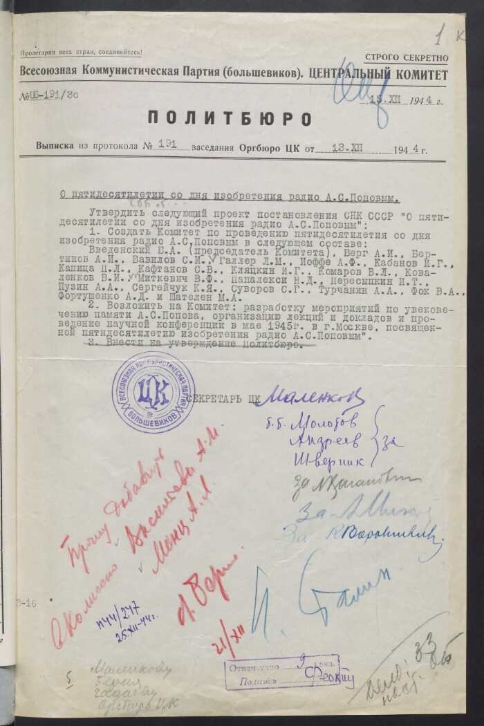 | Заголовок | Постановление Политбюро ЦК ВКП(б) "О пятидесятилетии со дня изобретения радио А. С. Поповым" |