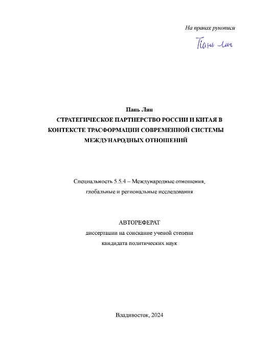 Стратегическое партнерство России и Китая в контексте трансформации современной системы международных отношений : автореферат диссертации на соискание ученой степени кандидата политических наук : специальность 5.5.4. Международные отношения / Пань Лин ; [Дальневост. фед. ун-т]. - Владивосток, 2024. -21 с. ; 21 см.. - Библиогр.: с. 20-21 (8 назв.).