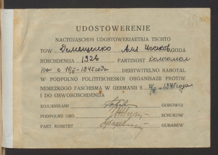 | Заголовок | Удостоверение подпольной комсомольской организации в Германии А. Демещенко |