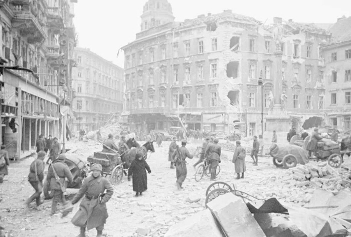 | Заголовок | Советские бойцы в одном из освобожденных кварталов г. Будапешта |