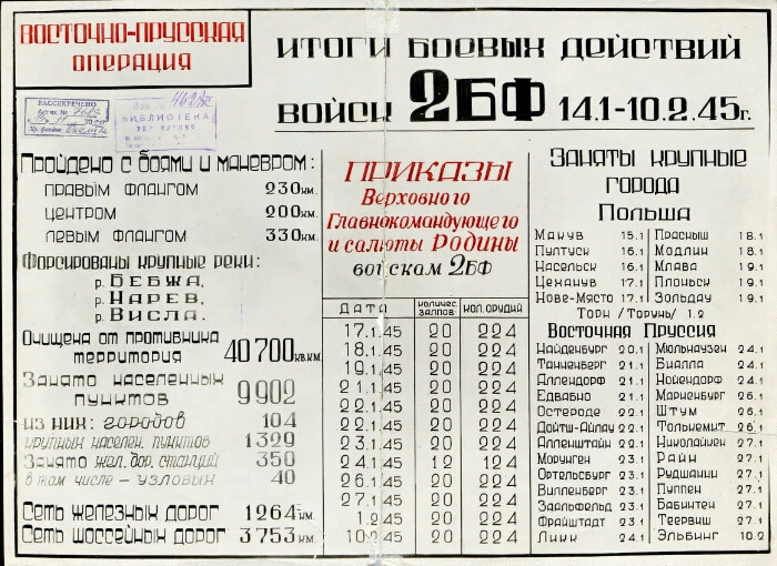 | Заголовок | Статистическая таблица "Итоги боевых действий войск 2-го Белорусского фронта" в Польше и Восточной Пруссии в период с 14 января по 10 февраля 1945 г. |