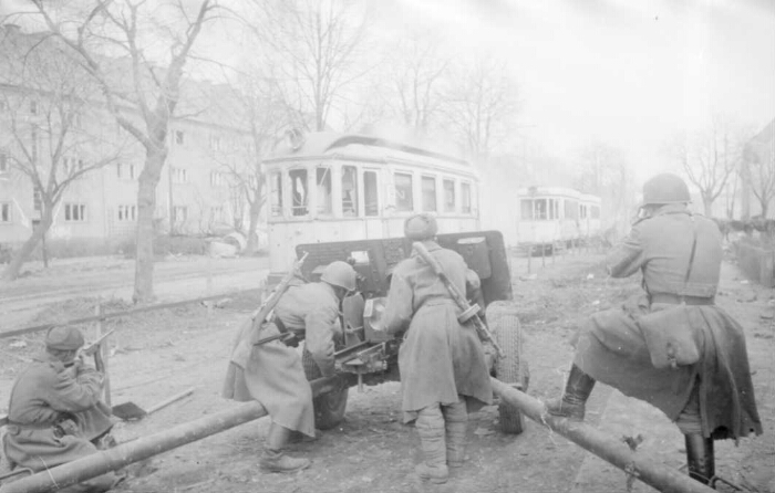| Заголовок | Артиллерийское подразделение гвардии лейтенанта Софронова ведет бой на одной из улиц Кенигсберга |
