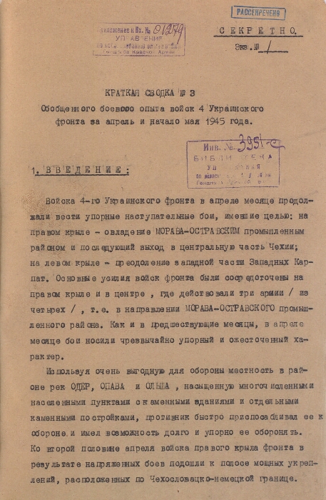 | Заголовок | Краткая сводка № 3 обобщенного боевого опыта войск 4 Украинского фронта за период с 6 по 11 мая 1945 г. |