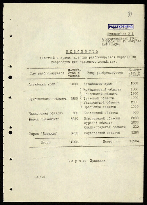 | Заголовок | Распоряжение ГКО СССР № 3951 с о поставке горючего из госрезерва для сельскохозяйственных работ, с приложением ведомостей областей, краев и республик |