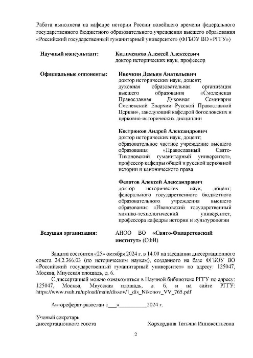 Политика советского государства в отношении православных церковных приходов в Московской губернии/области в 1918-1958 гг. : автореферат диссертации на соискание ученой степени доктора исторических наук : специальность 5.6.1. Отечественная история / Никонов Вадим Вадимович ; [Рос. гос. гуманит. ун-т]. - Москва, 2024. -60 с. ; 21 см.. - Место защиты: Российский государственный гуманитарный университет. - Библиогр.: с. 56-60 (38 назв.) и в подстроч. примеч.