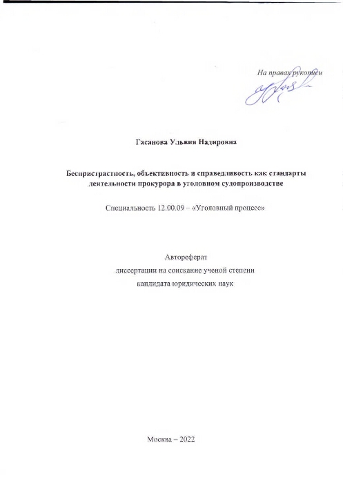 Беспристрастность, объективность и справедливость как стандарты деятельности прокурора в уголовном судопроизводстве : автореферат диссертации на соискание ученой степени кандидата юридических наук : специальность 12.00.09 / Гасанова Ульвия Надировна ; [ФГКОУ ВО "Ун-т прокуратуры РФ"]. - Москва, 2022. -35 с. : ил. ; 21 см.. - Библиогр.: с. 34-35 (7 назв.) и в подстроч. примеч.