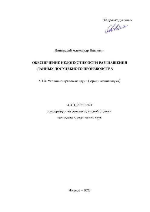 Обеспечение недопустимости разглашения данных досудебного производства : результаты компаративистского исследования досудебного производства : автореферат диссертации на соискание ученой степени кандидата юридических наук : специальность 5.1.4. / Липинский Александр Павлович ; [Удмуртский государственный университет]. - Ижевск, 2023. -32 с.. - Место защиты: Юго-Западный государственный университет. - Список работ авт.: с. 29-32 (12 назв.). - Библиогр. в подстроч. примеч.