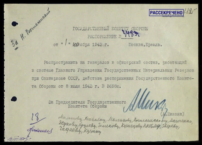 Распоряжение ГКО СССР № 4483 с о распространении на генералов и офицерский состав, работающий в системе Главного управления госу...