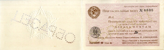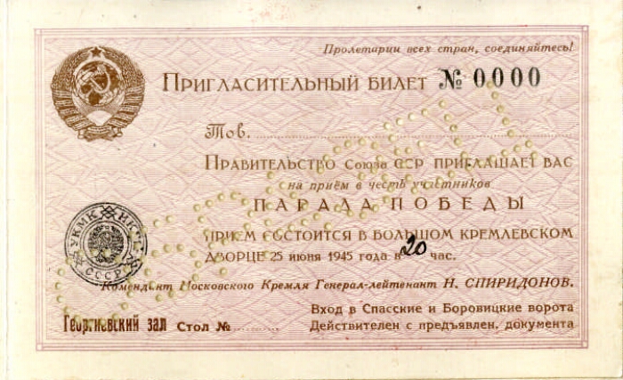 Образцы пригласительных билетов на торжественный прием в честь участников Парада Победы в Большом Кремлевском дворце 25 июня 1945 г. |