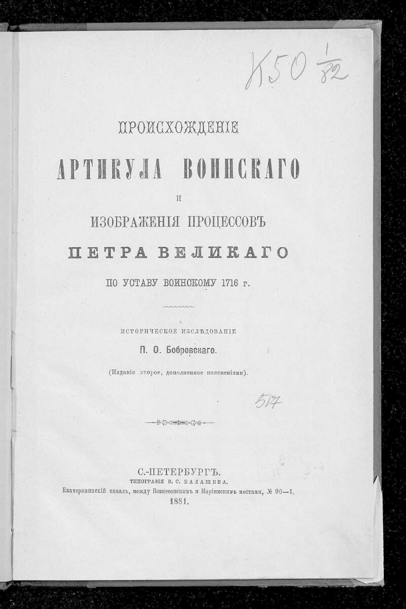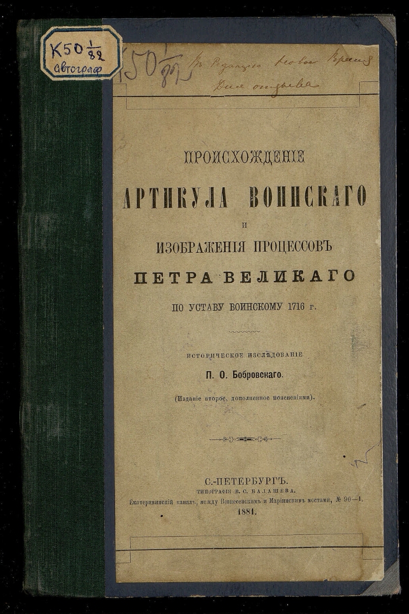 Происхождение артикула воинского и изображения процессов Петра Великого по Уставу воинскому 1716 г. : Историческое исследование П.О. Бобровского. - 2-е изд., доп. пояснениями. -Санкт-Петербург : Тип. В.С. Балашева, 1881. -46 с. ; 24,5 х 16 см. - Часть текста на нем. яз. Библиогр. в тексте и подстроч. примеч.. - Экз.: с автографом на обл. и рукоп. пометками.