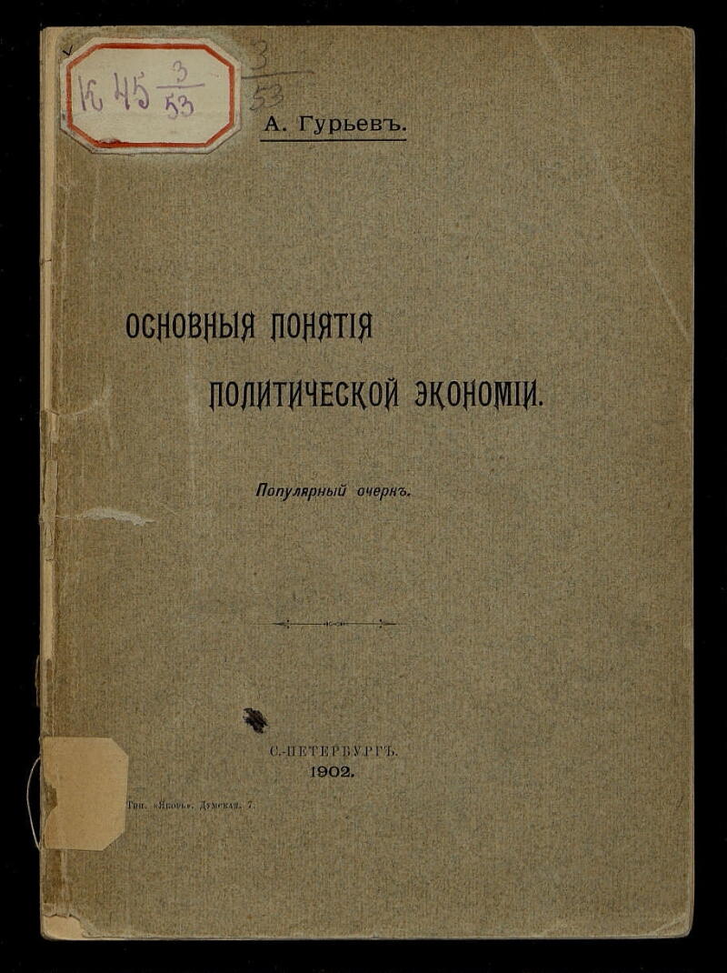 Основные понятия политической экономии : Популярный очерк / А. Гурьев. - Санкт-Петербург : Тип. "Якорь", 1902. -IX, 79, [2] с. ; 20 х 14 см. -