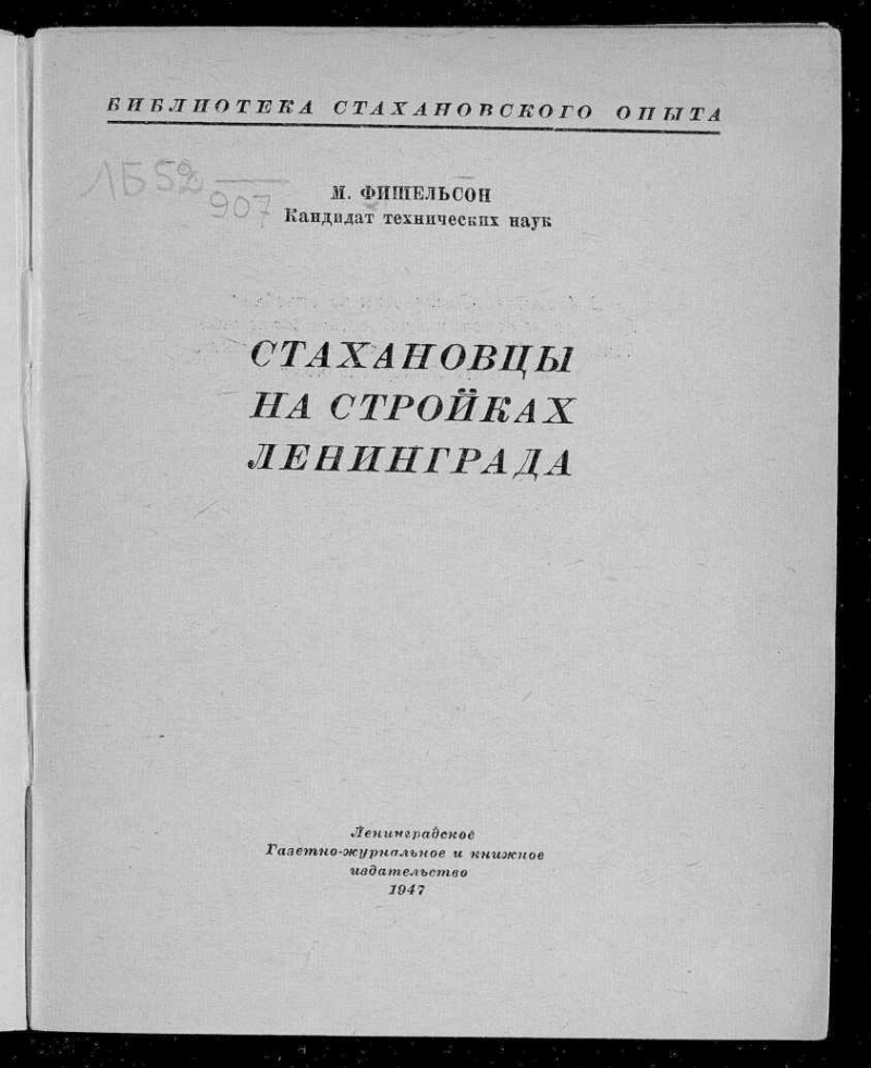 Стахановцы на стройках Ленинграда / М. Фишельсон, кандидат технических наук. - [Ленинград] : Ленинградское газетно-журнальное и книжное изд-во, 1947. -50, [2] с. : ил. ; 16,3 х 13 см. - (Библиотека стахановского опыта). - На обл. изд-во: Лениздат. На обл. авт.: Н. Фишельсон.