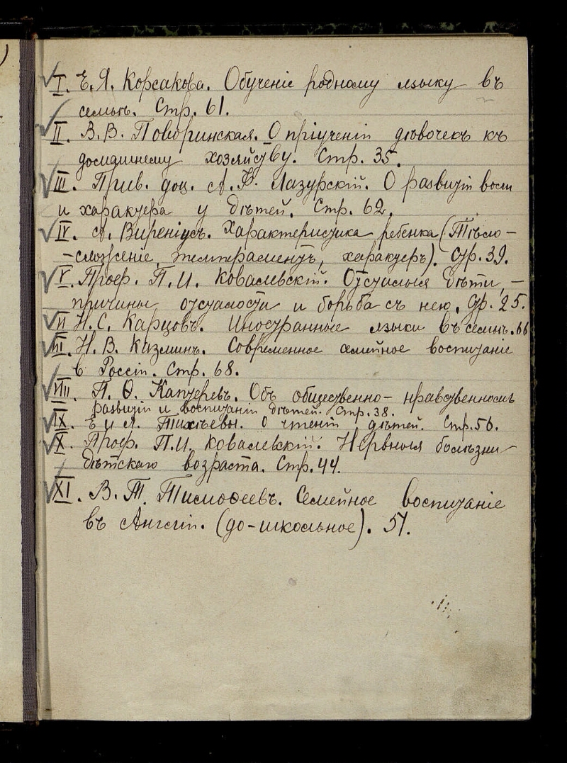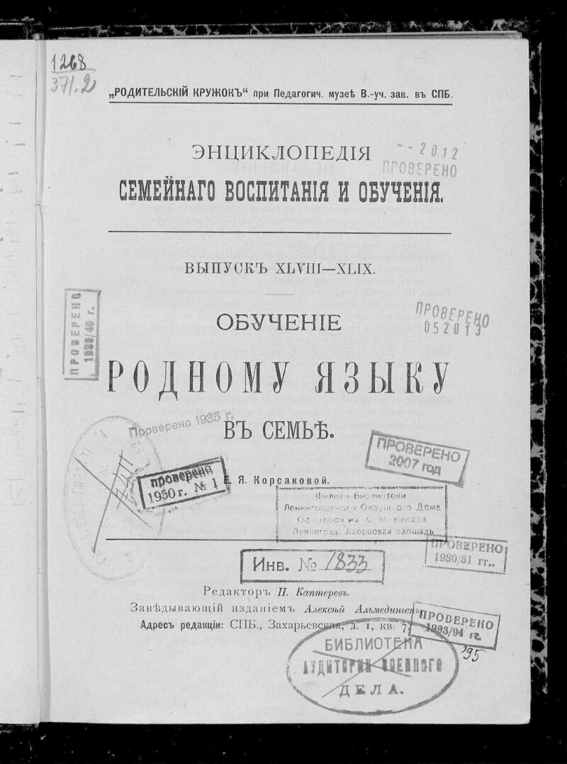Вып. 48-49: Обучение родному языку в семье / [Соч.] Е.Я. Корсаковой. - Тип. М.М. Стасюлевича, ценз. 1902. -61 с. ; 22,5 х 16,5 см. - Библиогр. в тексте и подстроч. примеч.. - Экз.: без обл., с рукоп. помет., во владельческом переплете.