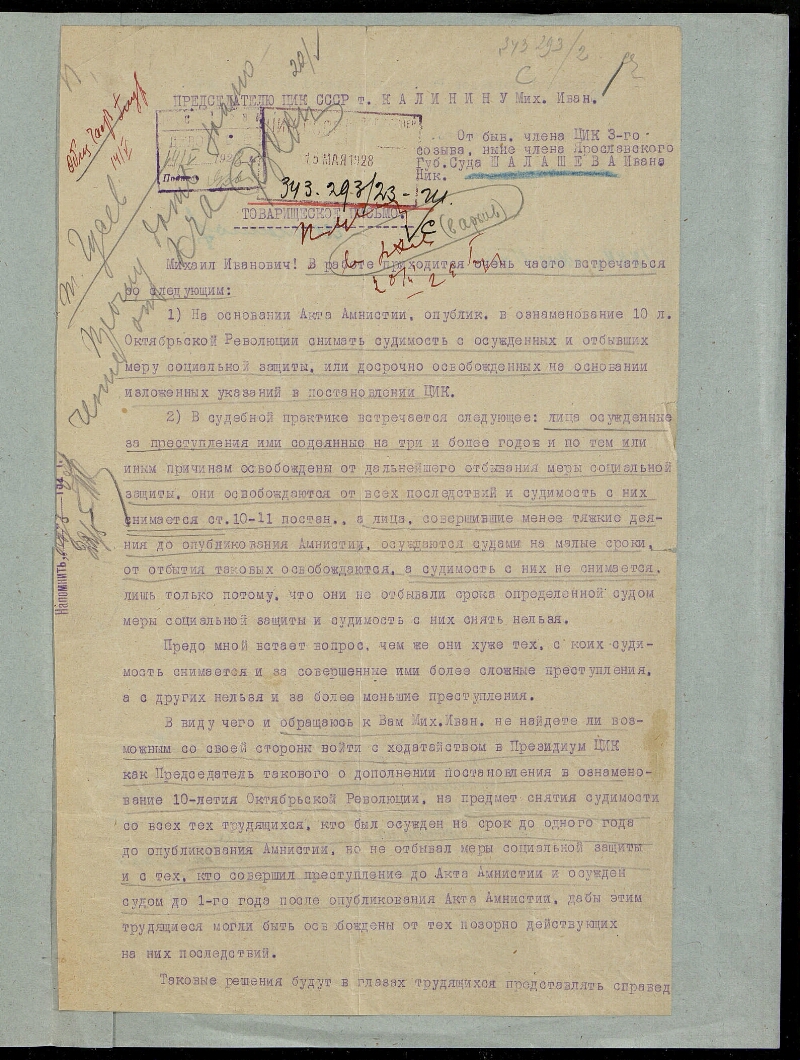 | Заголовок | Письмо б. члена ЦИК Шалашева И. Н. по вопросу о снятии судимости с тех трудящихся, которые были осуждены на срок до одного года до опубликования амнистии, но не отбыли меры социальной защиты |