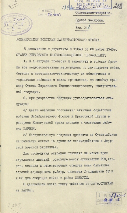 | Заголовок | Директива Ставки Верховного Главнокомандования № 11112 командующему Дальневосточным фронтом М. А. Пуркаеву о подготовке наступательной операции на Сунгарийском направлении |