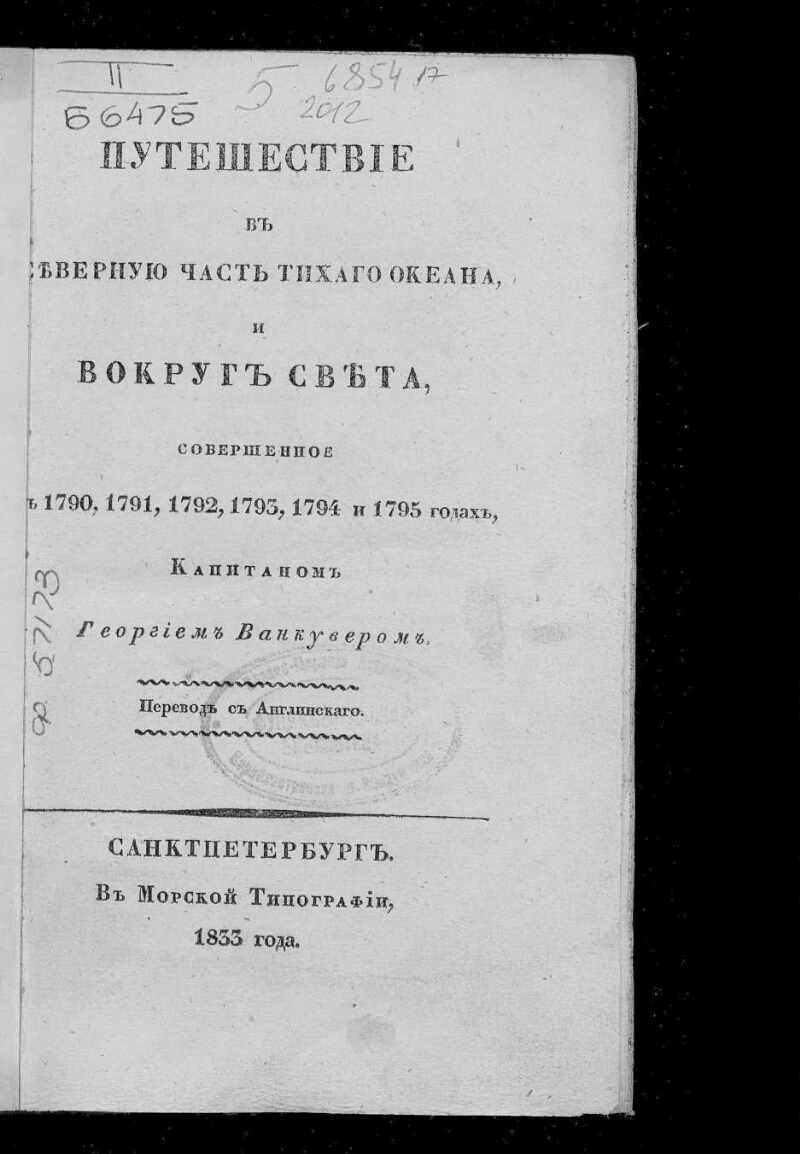 Путешествие в северную часть Тихого океана, и вокруг света, совершенное в 1790, 1791, 1792, 1793, 1794, и 1795 годах, капитаном Георгием Ванкувером : Перевод с английского / Г. Ванкувер. - Санкт-Петербург : [Б. и.], 1827-1838. - 21,8 х 13,4 см. -