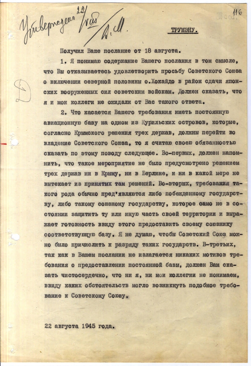 | Заголовок | Личное послание И. В. Сталина президенту США Г. Трумэну с ответом на требование американской стороны иметь авиационную базу на Курильских островах |