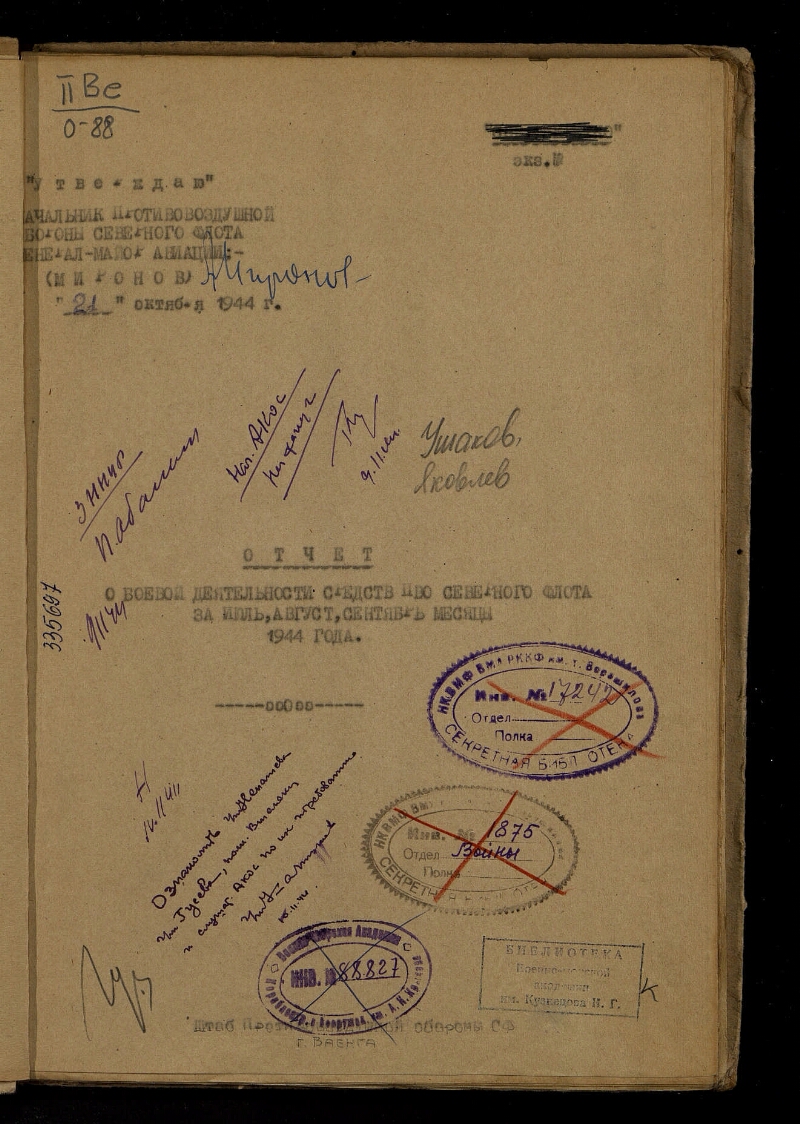 Отчет о боевой деятельности средств ПВО Северного флота за июль, август, сентябрь месяцы 1944 года / Ушаков, Яковлев. - Ваенга : Штаб Противовоздушной обороны СФ, 1944. -38, [1] л. : табл., диагр. ; 29,8 х 21,8 см. - Перед загл.: "Утверждаю" начальник противовоздушной обороны Северного флота генерал-майор авиации Миронов 21 октября 1944 г. На обл. изд-во: Штаб ПВО СФ. Машинописный текст. - Экз.: с рукоп. помет.