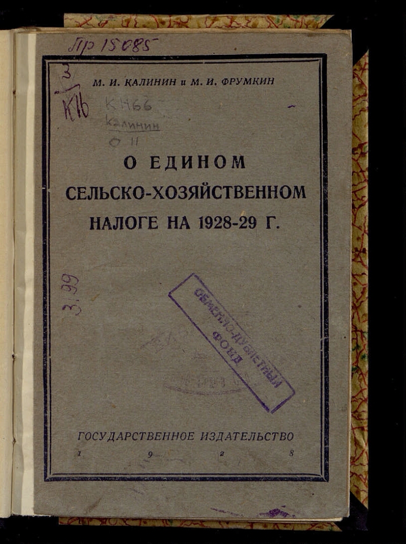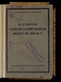 О едином сельско-хозяйственном налоге на 1928-29 г. : (Доклад и содоклад на III сессии ЦИК СССР IV созыва) / М.И. Калинин и М.И. Фрумкин. - Москва ; Ленинград : Государственное изд-во, 1928. -159, [1] с. : табл., диагр., граф. ; 17,8 х 12 см. - Библиогр. в подстроч. примеч.. - Экз.: во владельческом переплете.