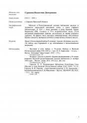 I. Национальная библиотека Республики Саха (Якутия).1. Суранова, Валентина Дмитриевна (1923 - 1991). 2. Библиотекари - солдаты Победы (коллекция). 3. Память о Великой Победе (коллекция). 4. Библиотекари -- Участие в Великой Отечественной войне -- 1941 - 1945. |