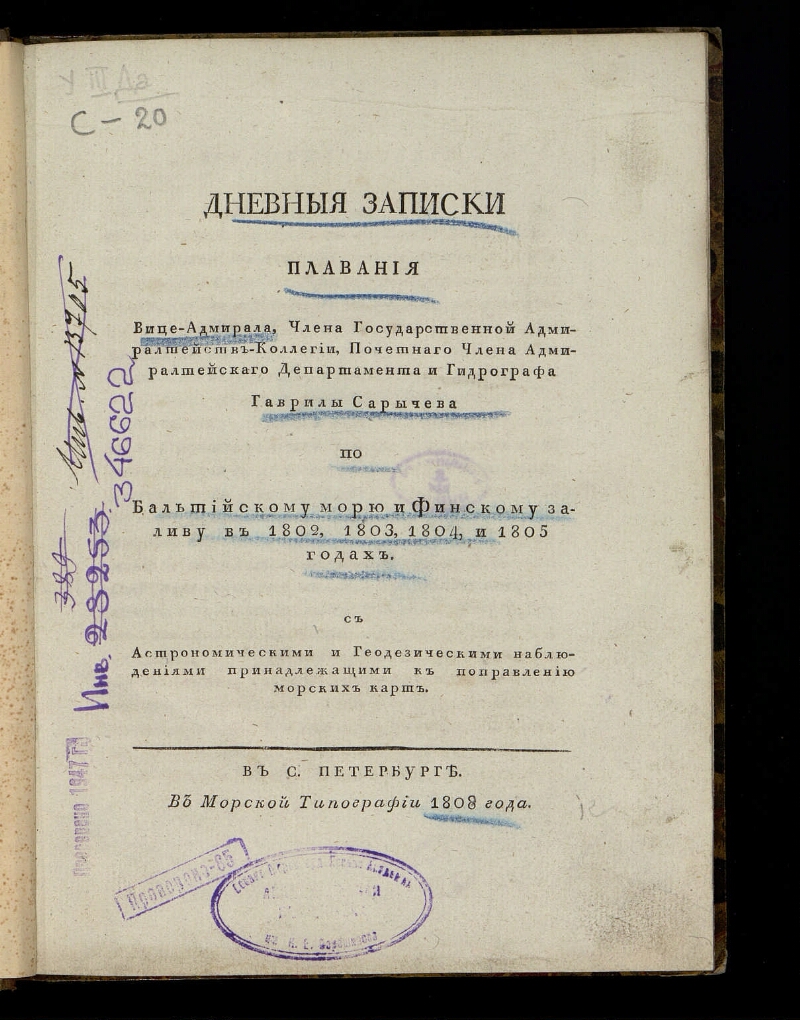 Дневные записки плавания вице-адмирала, члена Государственной Адмиралтейств-коллегии, почетного члена Адмиралтейского департамента и гидрографа Гаврилы Сарычева по Балтийскому морю и Финскому заливу в 1802, 1803, 1804 и 1805 годах : С астрономическими и геодезическими наблюдениями принадлежащими к поправлению морских карт / Гаврила Сарычев. - Санкт-Петербург : Морская тип., 1808. -177, [5] с. : табл. ; 25 х 19 см. - Колл. "КН" (Великий князь Константин Николаевич). Экз.: без обл., во владельческом переплете.