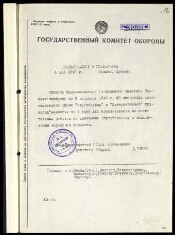 Распоряжение ГКО СССР № 8433 с о выделении Наркоматом внешней торговли Наркомату танковой промышленности во 2 квартале 1945 г. 20 импортных самосвалов фирмы «Студебеккер» и «Интернейшенел» грузоподъемностью по 5 тонн для использования на капитальных работах по жилищному строительству и механизации карьерных хозяйств. 6 мая 1945 г. - 1945. - РГАСПИ. Ф. 644. Оп. 1. Д. 412. Л. 12-12об. РГАСПИ. Ф. 644. Оп. 2. Д. 489. Л. 122-122об. Рассылочный и подлинный экземпляры.