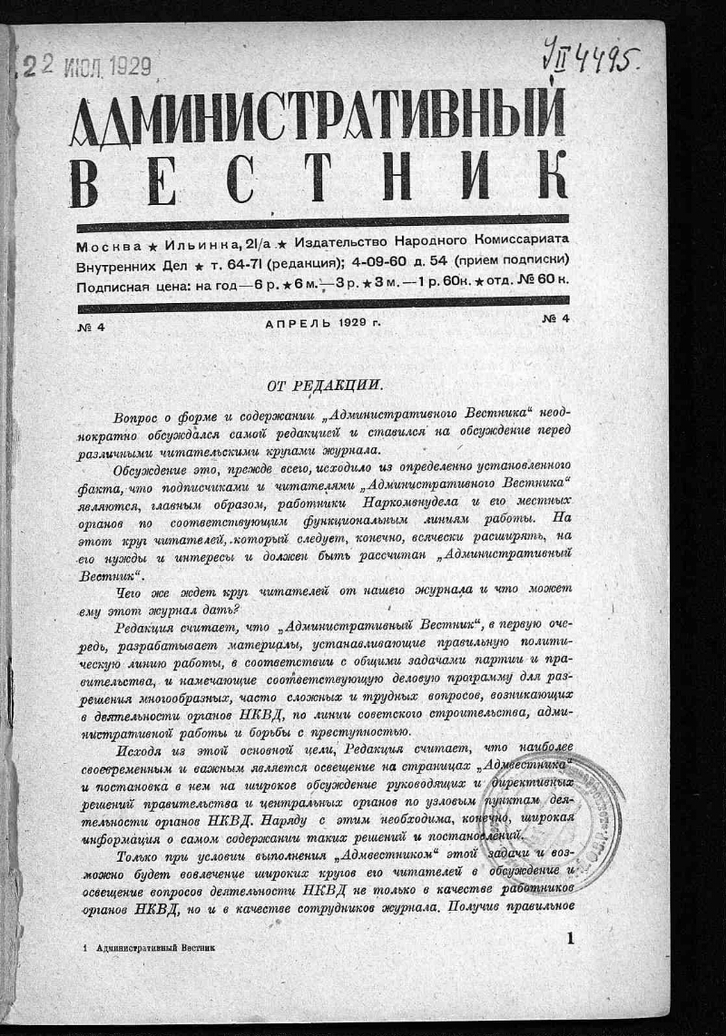 1929, № 4 (апрель). - Изд-во НКВД, 1929. - 110, [1] с. - Содерж.: разделы: Милиция в борьбе с преступностью, Исправительно-трудовое дело, Уголовный розыск и раскрытие преступлений, Вопросы подготовки, О чем нам пишут, Государственный институт по изучению преступности и преступника, За рационализацию, На местах, За рубежом, Хроника, Справочно-юридический отдел, Обзор законодательства; статьи: Директивы даны – надо их выполнить / Е. Ширвиндт. Пора задуматься / К. Г. Сколько у нас преступников-профессионалов и что с ними делать / Б. Утевский. Роль милиции в борьбе с преступностью / И. Киселев. «Ученье – свет, а неученье – тьма» / Ю. Бехтерев. Как составлен пятилетний план самоокупаемости мест заключения / М. Кесслер. Кто находится в мессах заключения / В. Якубсон. Проведение принудительных работ по новому закону / О. Р. Расследование половых преступлений / И. Якимов. Объем и методы криминалистики / И. Любарский и др. материалы