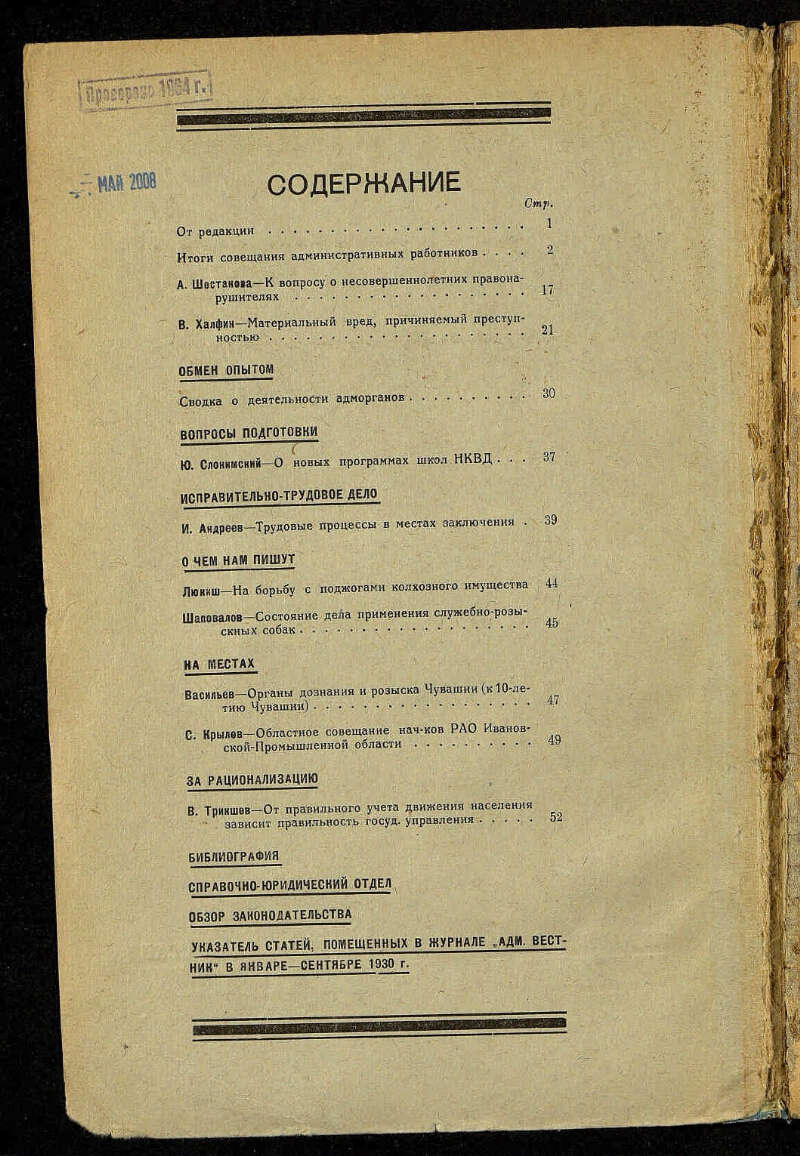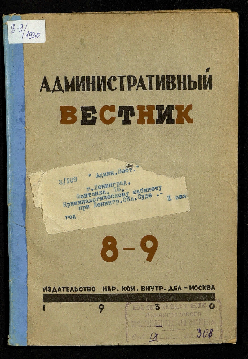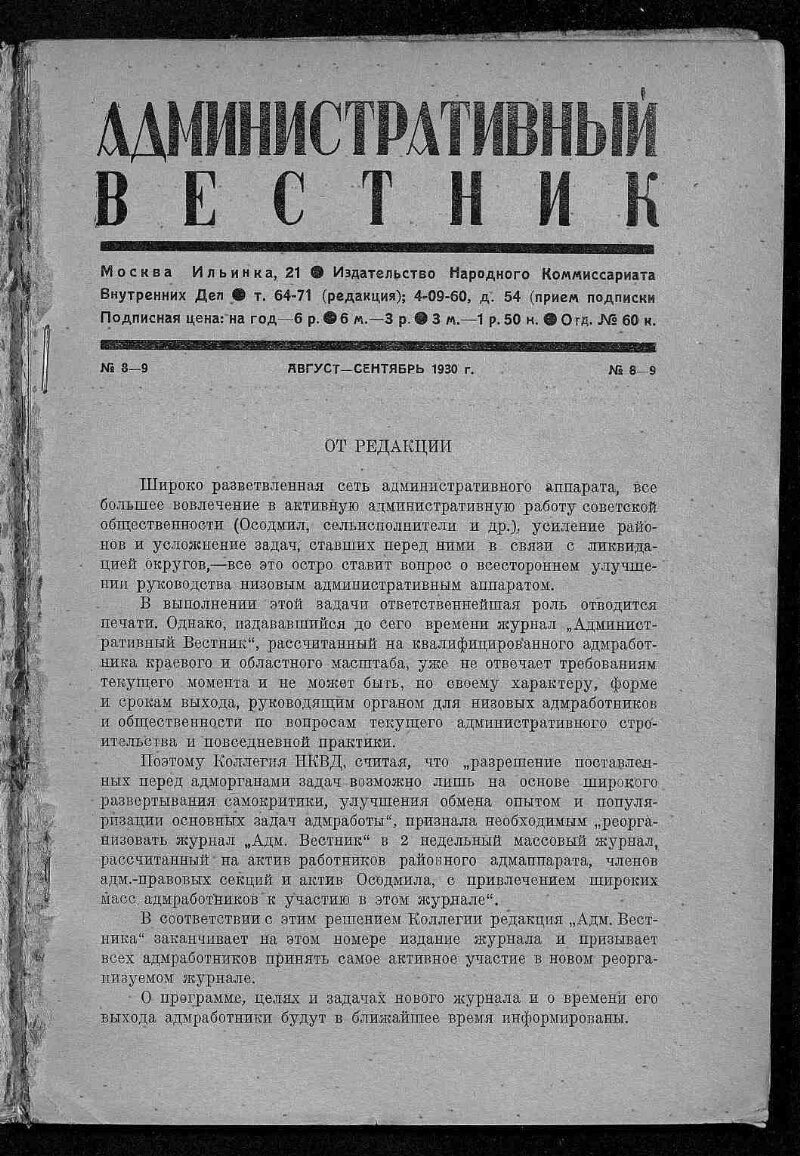 1930, № 8/9 (авг.-сент.). - Изд-во НКВД, 1930. - 71, [1] с. - Содерж.: разделы: Обмен опытом, Вопросы подготовки, Исправительно-трудовое дело, О чем нам пишут, На местах, За рационализацию, Библиография, Справочно-юридический отдел, Обзор законодательства, Указатель статей, помещенных в журнале «Адм. вестник» в январе – сентябре 1930 года. Статьи: К вопросу о несовершеннолетних правонарушителях / А. Шестакова. Материальный вред, причиняемый преступностью / В. Халфин. Сводка о деятельности адморганов. О новых программах школ НКВД / Ю. Слонимский. Трудовые процессы в местах заключения / И. Андреев. На борьбу с поджогами колхозного имущества / Люкиш. Состояние дела применения служебно-розыскных собак / Шаповалов. Органы дознания и розыска Чувашии (К 10-летию Чувашии) / Васильев. Областное совещание нач-ков РАО Ивановской Промышленной области / С. Крылов. От правильного учета движения населения зависит правильность госуд. управления / В. Триншев и другие материалы
