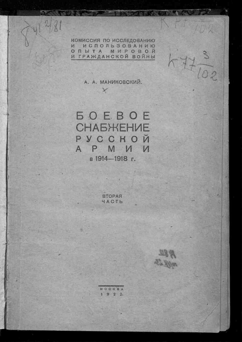 Боевое снабжение русской армии в войну 1914-1918 гг. : Ч. 1 - 3 / А. А. Маниковский ; Комиссия по исследованию и использованию опыта мировой и гражданской войны. - Москва, 1920 - 1923. - 24 см