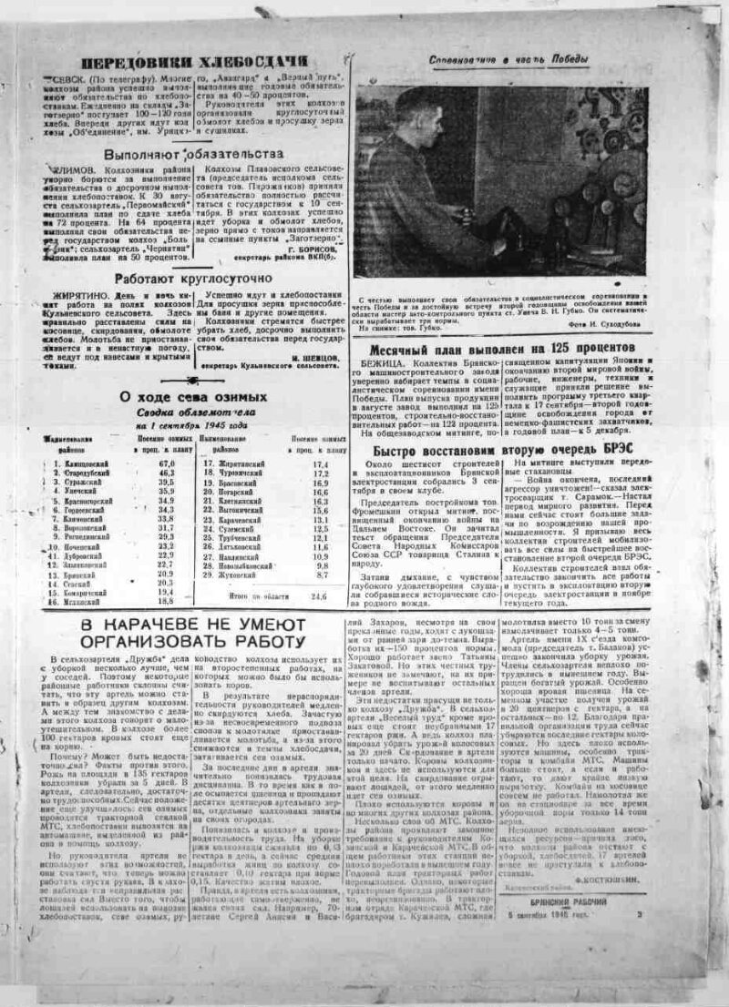 Брянский рабочий : орган Брянского обкома, горкома ВКП(б) и облисполкома. - 1917, № 1 (1 сентября) -. - Брянск, 1917-. - Периодичность различная: 5 раз в неделю (вторник, среда, четверг, пятница, суббота), 4 раза в неделю, 2 раза в неделю, еженедельно по четвергам. - Основана в 1917 г. Первый номер газеты вышел 1(14) сентября 1917 г. Первый номер областной общественно-политической газеты "Брянский рабочий" вышел 1(14) сентября 1917 года. В декабре 1917 г. "Брянский рабочий" объединился с газетой "Известия Брянского Совета рабочих, солдатских и крестьянских депутатов" и стал выходить под названием: "Известия Брянского губкома и губисполкома". В августе 1922 года газета переименовывается вновь в "Брянский рабочий". С 1944 года - орган Брянского областного и городского комитетов ВКП(б) и исполкома областного Совета депутатов трудящихся. С 1980 г. - орган Брянского областного комитета КПСС и Брянского областного Совета народных депутатов. В настоящее время "Брянский рабочий" - региональная информационно-аналитическая газета Брянской области. Учредители: ООО "Редакция газеты "Брянский рабочий", Брянская областная ассоциация промышленных и коммерческих предприятий (работодателей). Издатель: ООО Редакция газеты "Брянский рабочий". Главный редактор: Мельников Владимир Сергеевич. Публикуется оперативная и достоверная информация о жизни города и области, аналитические материалы профессиональных журналистов по проблемам экономики, производства, образования, культуры, медицины. Источники: сайт MediaGid (http://www.mediagid.net/), сайт Путешествие по Брянску (http://puteshestvie32.ru/content/smi-2)