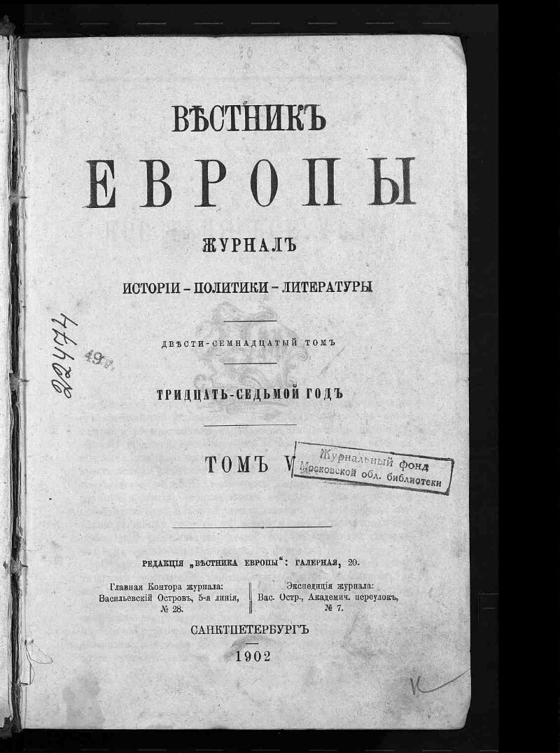 Вестник Европы. - Г. 1 1866 (9 марта)- Г. 53 1918. - Санкт-Петербург, 1866-1918. - В подзаголовке: 1866-1867 - Журнал историко-политических наук; 1868-1909 - Журнал истории, политики, литературы ; 1910-1917 - Журнал науки, политики, литературы, основанный М. М. Стасюлевичем в 1866 г. Место издания: 1866-1914 Санктпетербург; 1914-1918 Петроград. Редактор-издатель (до 1908 г.) М. М. Стасюлевич, с 1909 по 1916 — профессор М. М. Ковалевский; В 1914 г. журналом руководили три соредактора – К. К. Арсеньев, Овсянико-Куликовский и ученый-экономист А. С. Посников, с 1916 по 1918 — Д. Д. Гримм и Д. Н. Овсянико-Куликовский, при участии К. К. Арсеньева и А. С. Посникова. С 1866 года по 1868 год выходило по 4 тома в год, с 1869 года — ежемесячный. До 1909 г. в сигнатуре издания указывались также порядковые номера, года и тома, продолжающие счет лет и томов предыдущего журнала, издаваемого Н. М. Карамзиным в 1802-1830 годах. Выходит с 9 марта 1866 года. "Вестник Европы" - отечественный литературно-политический и исторический журнал, продолжил традицию одноименного журнала, основанного в 1802 году Н. М. Карамзиным. В журнале преимущественное внимание уделялось истории и политике. Печатались известные ученые и публицисты: К. А. Тимирязев, И. М. Сеченов, В. Ю. Скалон, И. И. Мечников, С. М. Соловьев, К. Д. Кавелин, А. Ф. Кони, Е. К. Рапп, А. Н. Веселовский, А. Н. Пыпин, Д. Н. Овсянико-Куликовский, Ф. Ф. Зелинский, Ф. Ф. Мартенс, К. К. Арсеньев, А. С. Хаханов и другие. В литературном отделе - И. С. Тургенев, И. А. Гончаров, А. Н. Островский, П. Д. Боборыкин, В. С. Соловьев, М. Е. Салтыков-Щедрин, а также статьи по финансово-экономическим вопросам и публицистика Г. Б. Иоллоса, А. Ф. Жохова, А. В. Жиркевича, П. Х. Шванебаха