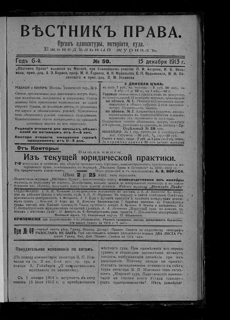 Вестник права : орган адвокатуры, нотариата, суда : еженедельный журнал, издаваемый в Москве. - Москва, 1913-1917. - Загл.: 1907/1908 Нотариус ; 1909-1913 № 39 Вестник права и нотариата. В 1917 г. на № 35/52 издание прекратилось. Ред.-изд.: 1913 № 40-1917 № 28/30 ред. И. С. Урысон и О. С. Урысон. Издавался в Москве, при ближайшем участии: П. И. Астрова, А. Э. Вормса, Н. К. Муравьева, С. П. Ордынского и Н. Н. Полянского. Пагинация: с 1913 № 40 пагинация продолжающаяся, стр. 2097—3474 ; с 1914 пагинация годичная, 1268—1564 стр. Периодичность: 1910—1916 по 52 номера в год. - Вых. с 1913 г. № 40 . Указ. содерж.: за 1912—1916 годовые указатели. Отд. вып. 30 стб. (35 с.) ; за 1914—1916 в последнем номере соотв. года