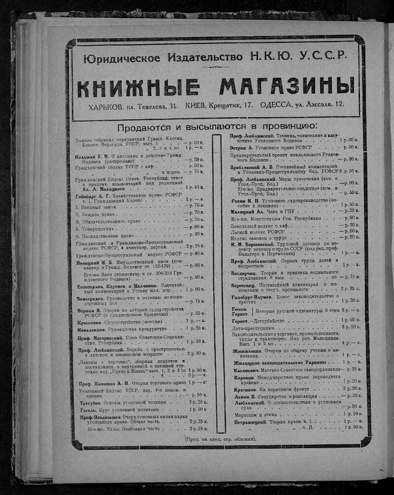 Издательство: 1922 Народный комиссариат юстиции; 1923 № 2 Народный комиссариат юстиции и УЮРО; 1923 № 3 - 1928 Юридическое издательство НКЮ УССР.