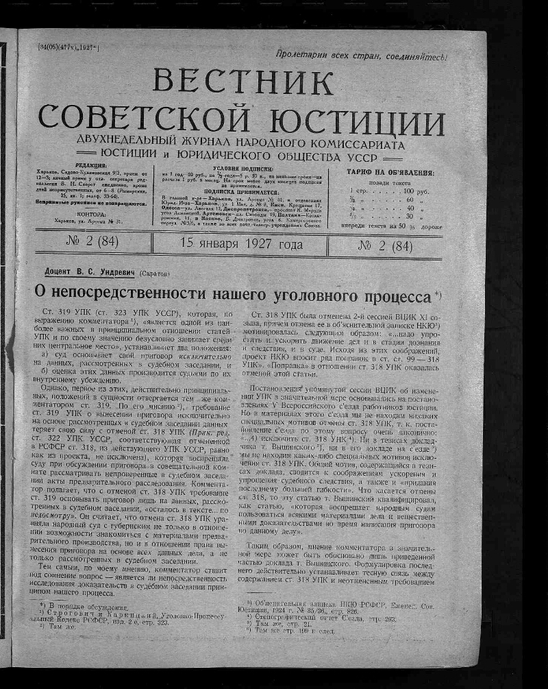 1927, № 2 (84). - 1927. - 78 с. - Содерж.: О непосредственности нашего уголовного права / доцент В. С. Ундревич. Переход торговых и промышленных предприятий на ходу / А. С. Ратнер. Недействительность внеуставных сделок / И. Жагелев. Частное посредничество в сделках между госорганами / Я. Рапопорт. Ст. 131 Земельного кодекса / А. И. Воронцов, [и другие материалы]. - Библиография в подстрочных примечаниях. - 4000 экз.