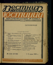 Вестник советской юстиции : двухнедельный журнал / орган Народного Комиссариата Юстиции УССР и Юридического общества УССР. - Харьков : Юридическое издательство НКЮ УССР, 1922-1928. - Заглавия: Вестник советской юстиции на Украине (1922, № 1-2), Вісник радянської юстиції (1929-1930), Революційне право (март 1931 - май 1941), Радянське право (1957-1991), Право України (с 1992). Подзаголовок: 1922 № 3/4-5/7 Ежемесячный журнал Народного комиссариата юстиции УССР; 1923 № 2 - 1925 Двухнедельный журнал : орган Народного комиссариата юстиции УССР и Украинского Юридического общества; 1926-1928 Двухнедельный журнал Народного комиссариата юстиции и Юридического общества УССР. Издательство: 1922 Народный комиссариат юстиции; 1923 № 2 Народный комиссариат юстиции и УЮРО; 1923 № 3 - 1928 Юридическое издательство НКЮ УССР. Первый редактор - Евсей Густавович (Гдальевич) Ширвиндт (1891-1958), доктор юридических наук, профессор. Журнал имел филиалы в Киеве, Одессе, Екатеринославе, Артемовске, Полтаве и Москве. В журнале печатались статьи общего государственно-политического характера, теоретические разработки по различным отраслям права, освещались вопросы практики правоохранительных органов, судов, арбитража, предоставлялась информация о правовой жизни. Среди авторов научных статей: профессора М. Гродзинский, В. Трахтеров, В. Гордон, В. Корецкий, С. Ландкоф, Г. Матвеев, Д. Сусло, С. Тихенко и др.