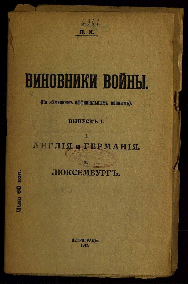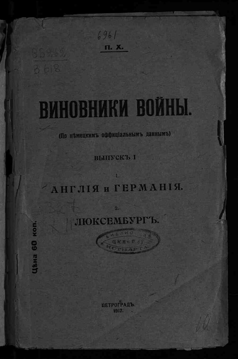 Виновники войны : (по немецким официальным данным) : Вып. 1- / П. Х. - Петроград : типография т-ва издательского дела "Сила земли", 1917. - 21 см