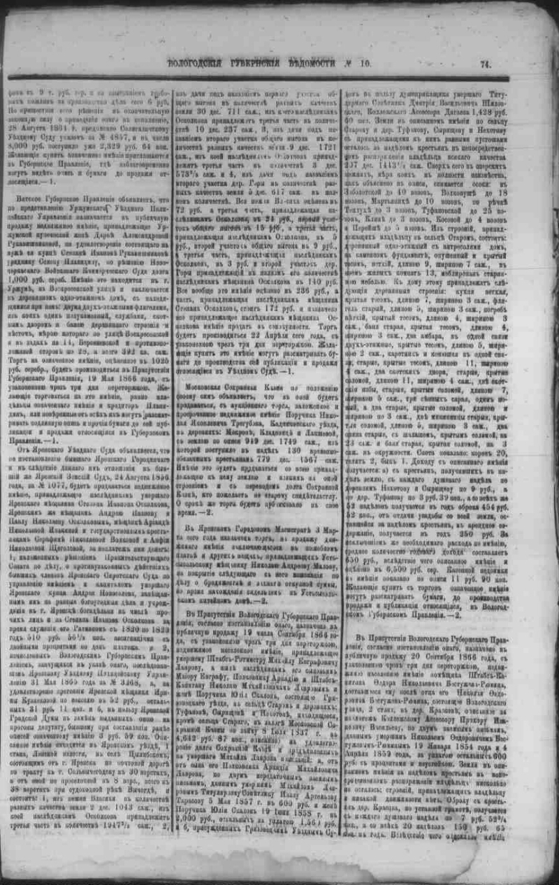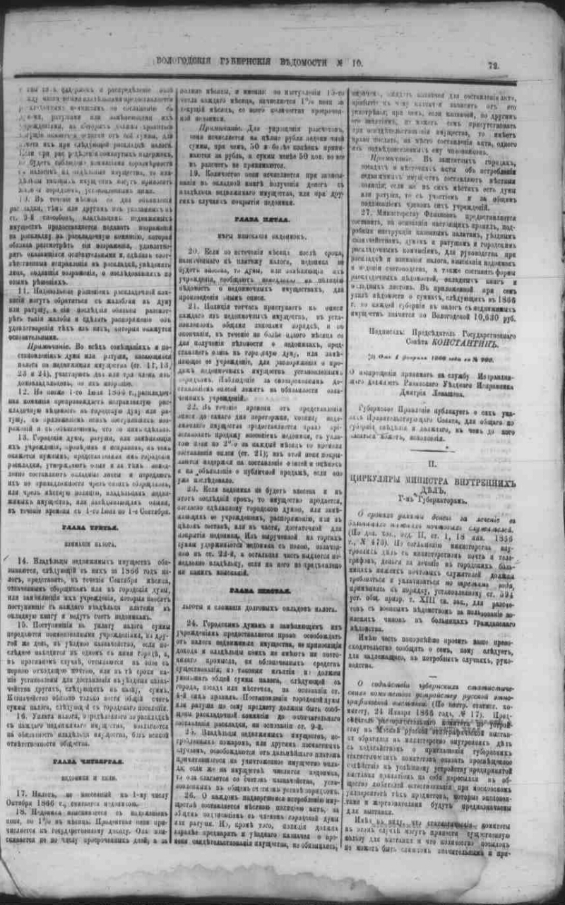 1866, № 10 (5 марта). - С. [70]-79, [4] с. - Содерж. также: К № 10 Вологод. губерн. ведом.: Циркуляры министра внутренних дел г-м губернаторам