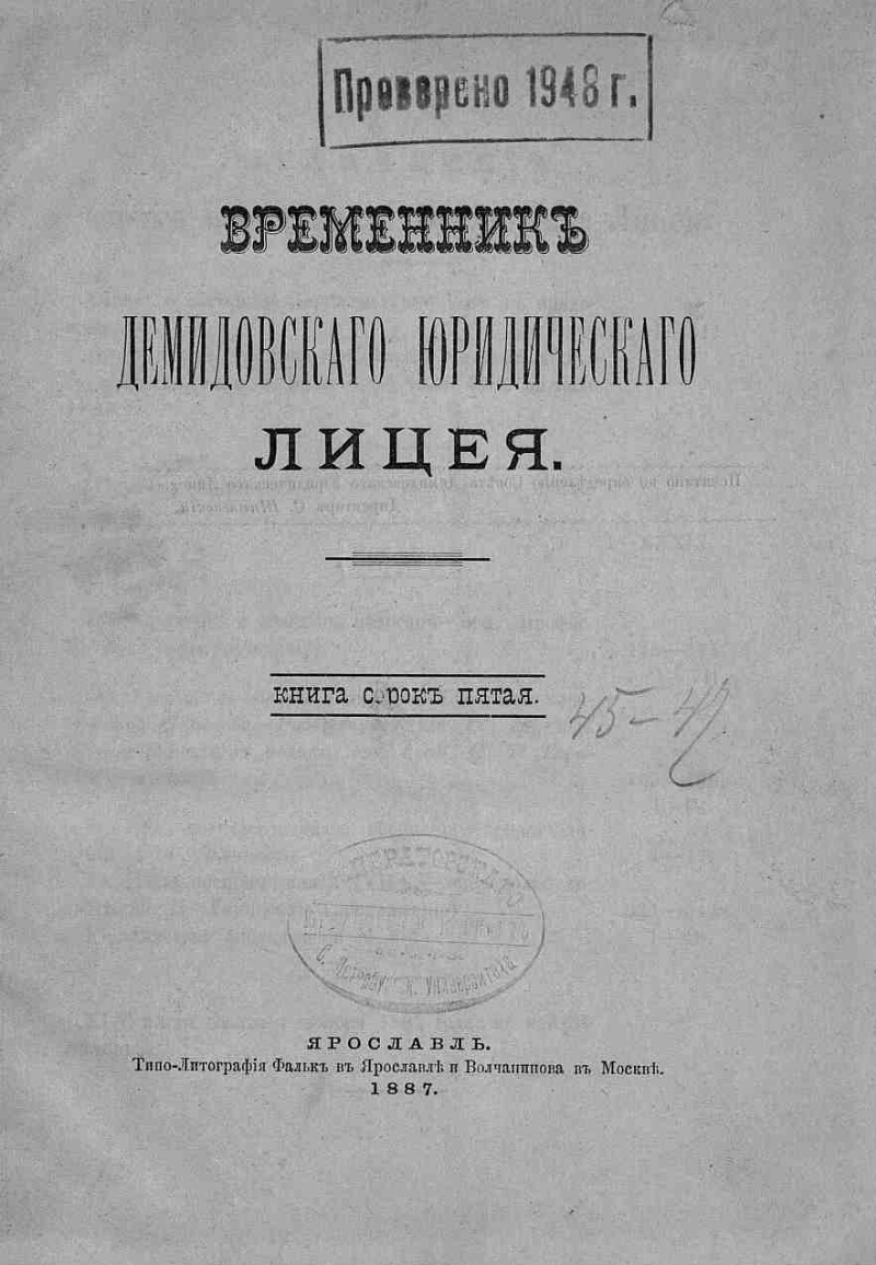 Кн. 45. - 1887. - Разд. паг. - Изд-во: Типо-литография Г. В. Фальк в Ярославле и Волчанинова в Москве. В конце оглавления: XLV книга вышла 1 ноября 1887 г.; в ней 30 листов. Содерж.: Отчет о состоянии Лицея за 1886 год, с приложениями (С. 1-41). Отчет правления Попечительства о недостаточных студентах Лицея за время с 1-го июля 1886 г. по июль 1887 г. (С. 1-17). Летопись Лицея за 1886/7 уч. год, с приложениями (С. 1-9) (С. I-XXXIX). Очерк теории и политики налогов. Орд. проф. А. А. Исаева (окончание) (С. 145-174) (С. I-VII). Исследование в области национальной экономии классической древности - Родбертуса. Вып. IV, перевод Н. Боевского, под редакцией ордин. профес. И. Т. Тарасова (окончание) (С. 163-185) (С. I-IV). О начале государственного обвинения - приват-доцента А. Ф. Зачинского (С. 1-17). Угличские писцовые книги XVII в. - и. д. доцента М. А. Липинского (продолжение) (С. 321-544). Юридическая библиография № 5-й (С. 1-48)