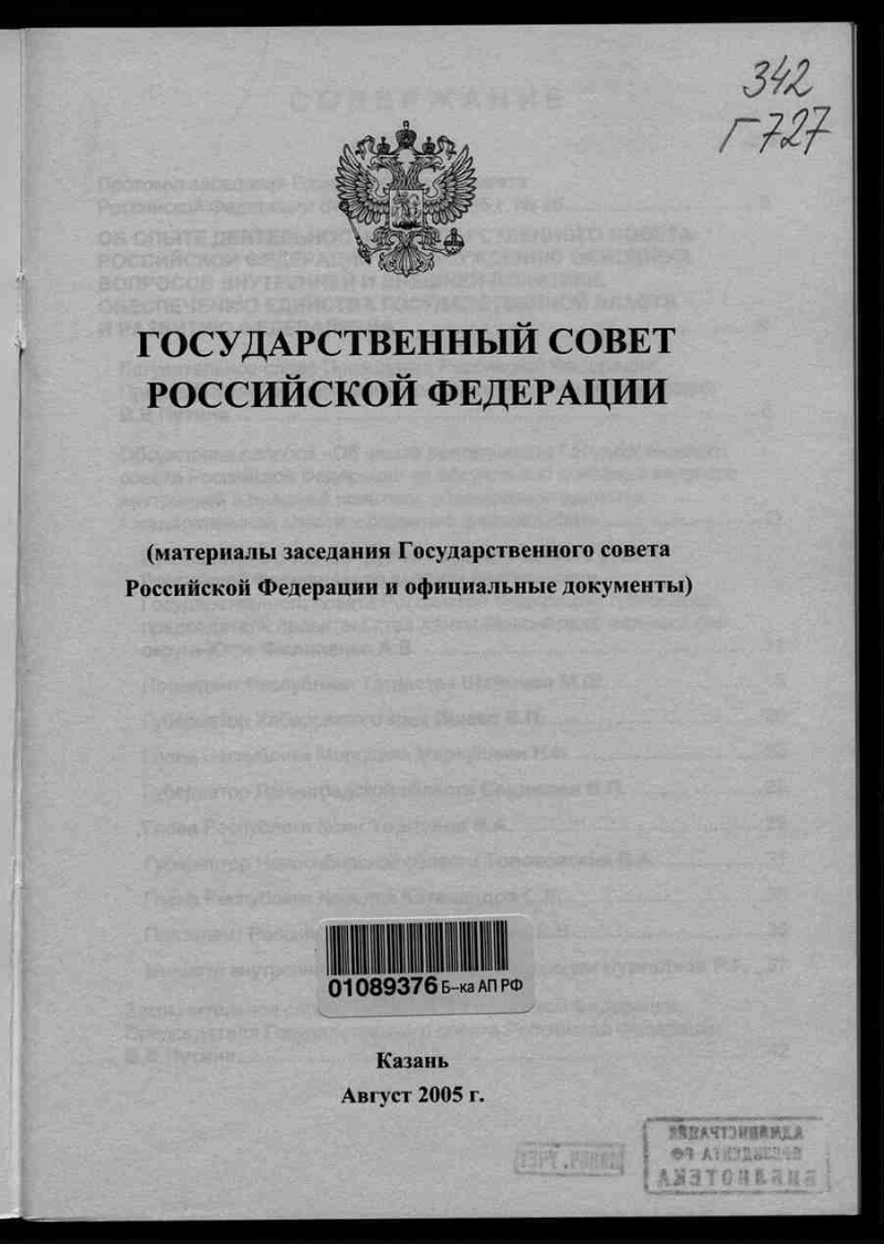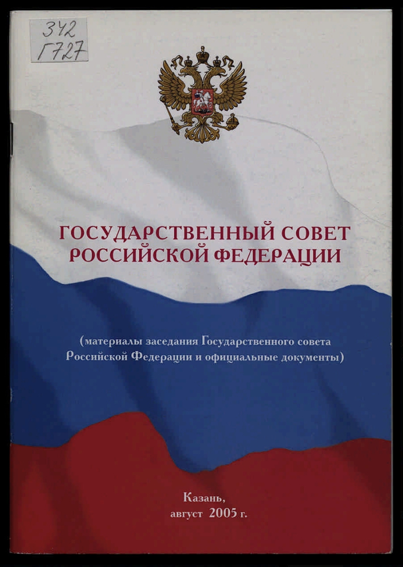 Государственный совет Российской Федерации : (материалы заседания Государственного совета Российской Федерации и официальные документы) : [г. Казань, 26 августа 2005 года]. - Казань, август 2005 г. - 45 с. : факсимил. ; 20,5х14,5 см