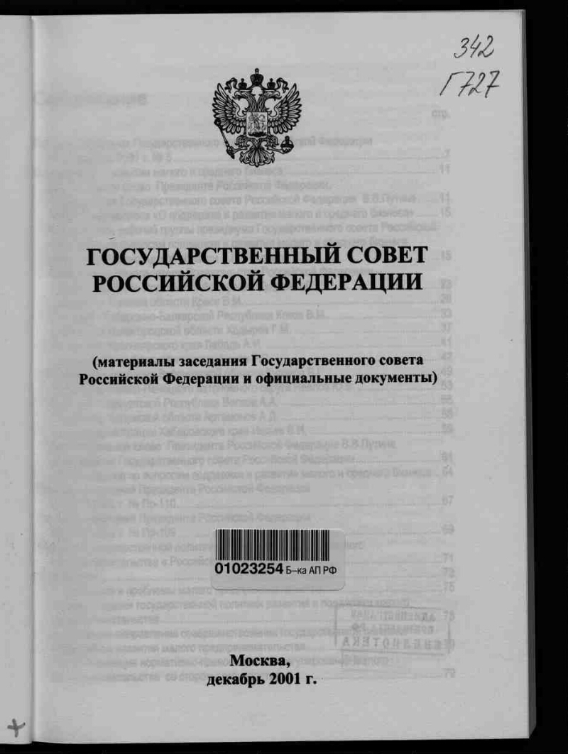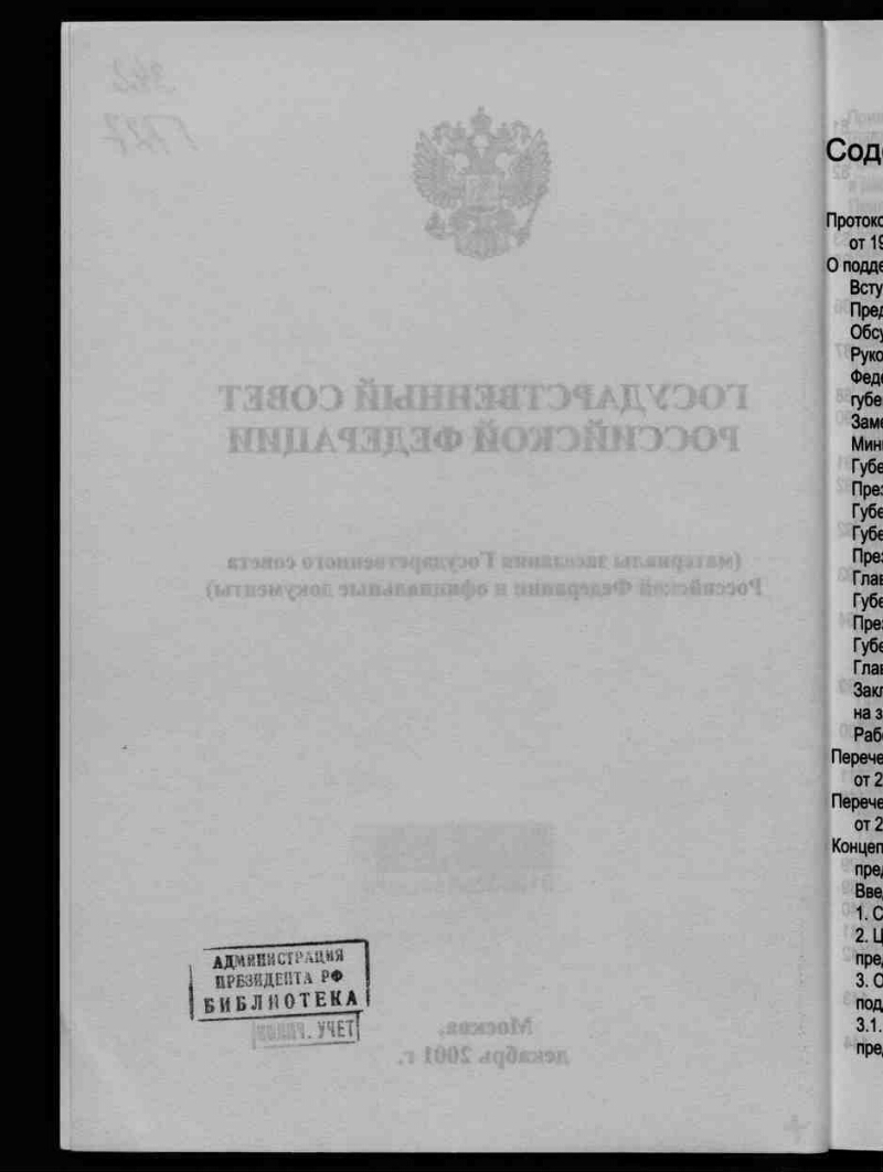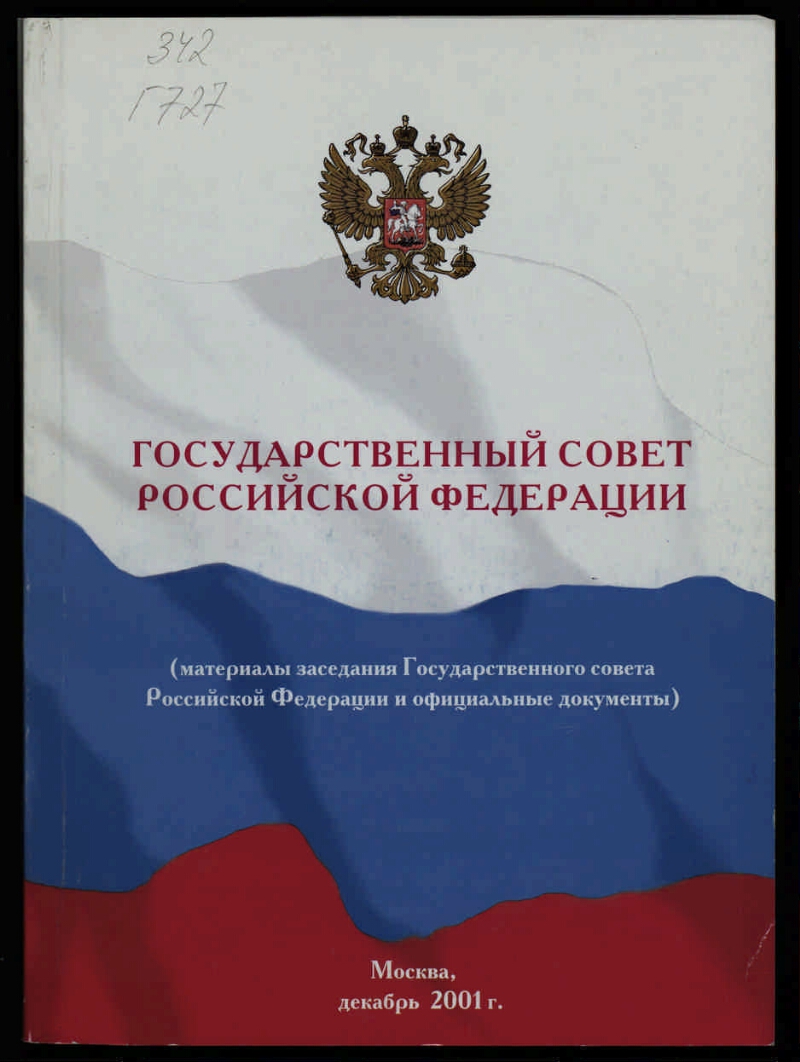 Государственный совет Российской Федерации : (материалы заседания Государственного совета Российской Федерации и официальные документы) : [г. Москва, 19 декабря 2001 года]. - Москва, декабрь 2001 г. - 242 с. : ил.; схем. ; 20х14,5 см