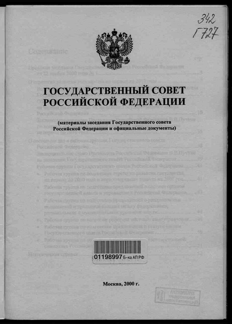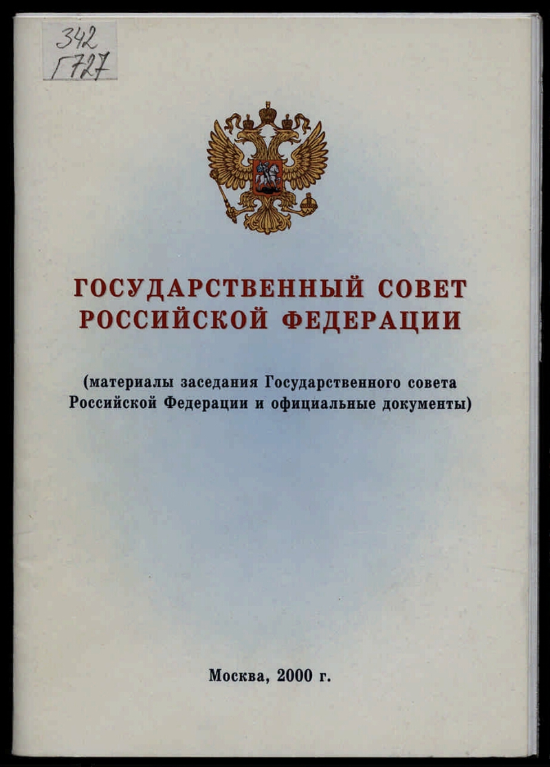 Государственный совет Российской Федерации : (материалы заседания Государственного совета Российской Федерации и официальные документы) : [г. Москва, 22 ноября 2000 года]. - Москва, 2000. - 54 с. : ил., схем., факсимил. ; 21х14,8 см
