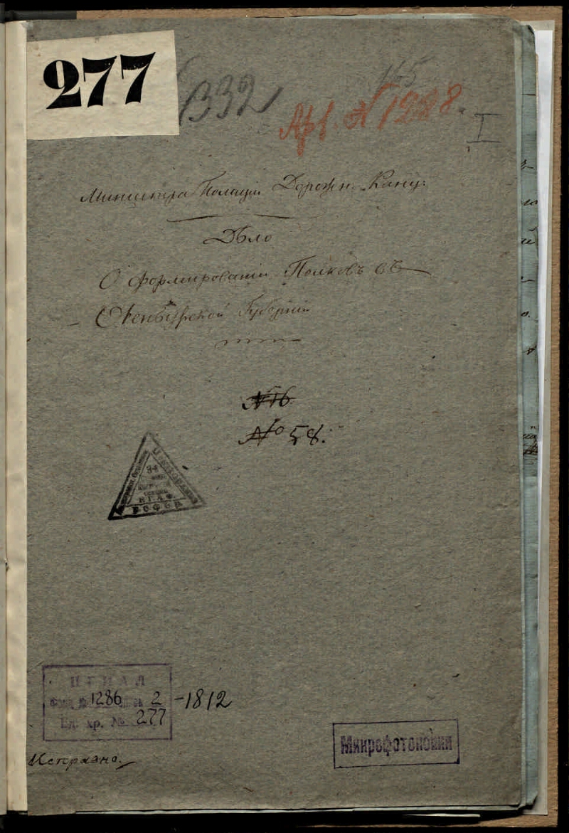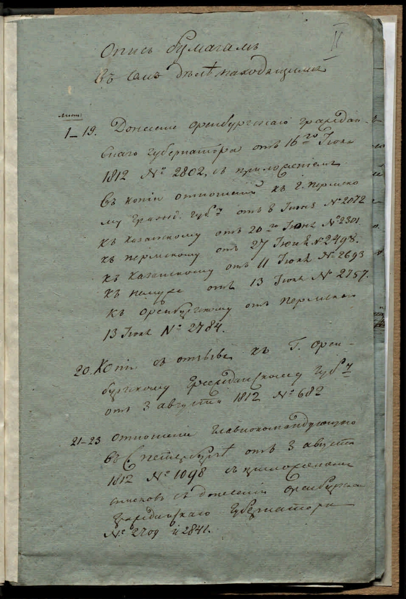 Дело о формировании 12 полков по Оренбургской губернии [Дело] : 1812 г. - 1812. - 35 л. ; 36,5x26 см. - (Фонд Департамент полиции исполнительной МВД. Опись № 2, 1811-1820 гг.). - Рукописный текст. Ориг. заголовок дела: Дело о формировании полков в Оренбургской губернии. Дело содержит документы, связанные с Высочайшим Манифестом 23 марта (4 апреля) 1812 г., объявлявшим 82-й рекрутский набор и о формировании в Оренбургской губернии нового полка: копии указов и служебные записки, уточняющие порядок проведения набора и формировании полка на территории Оренбургской губернии, предписания и указания Комитета министров в губернию, выписки из журналов заседаний Комитета министров, донесения и рапорты Оренбургского губернатора, отношения и предложения по поводу набора и личного состава формирующегося полка различных министерств и ведомств