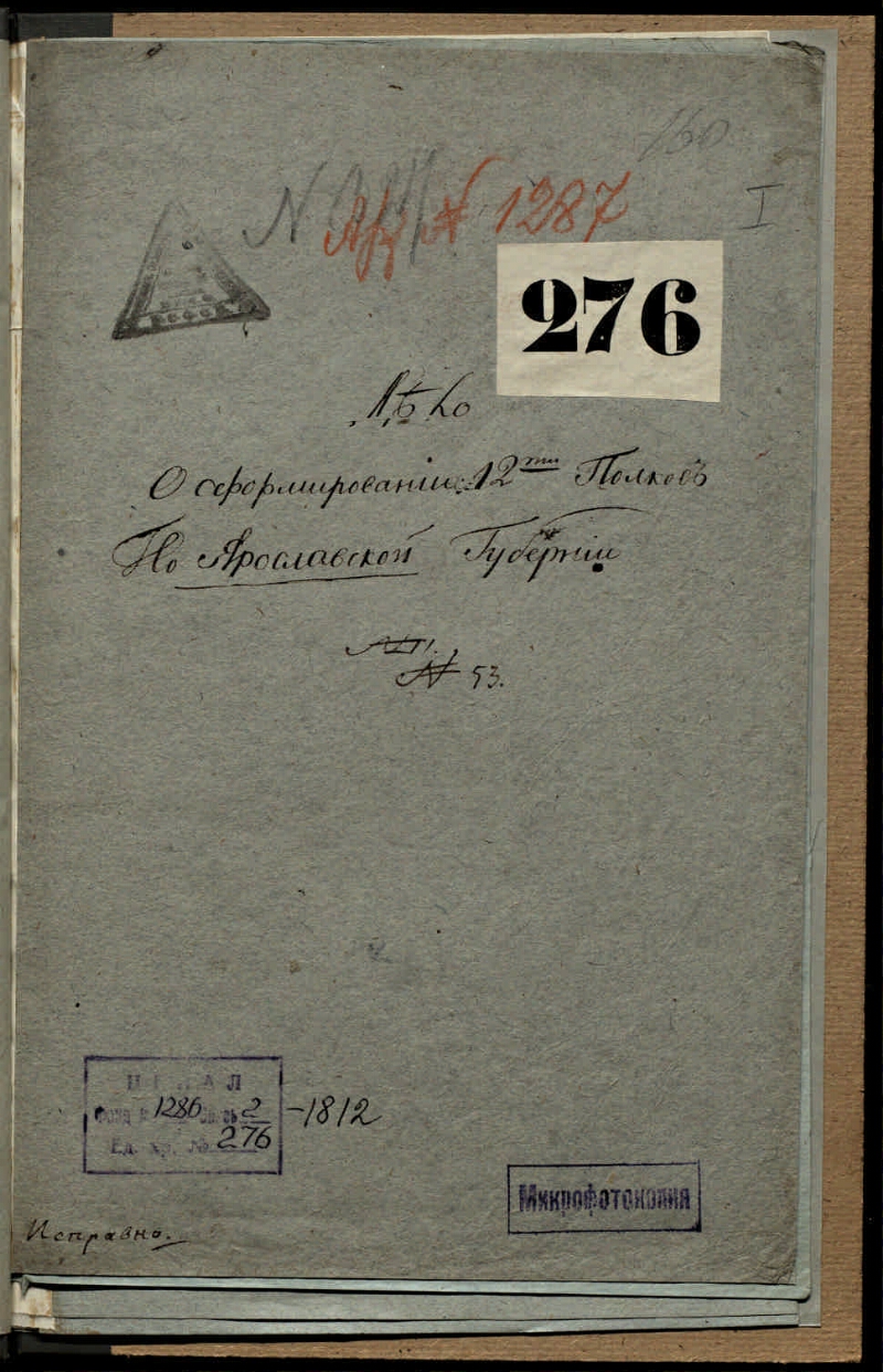 Дело о формировании 12 полков по Ярославской губернии [Дело] : 1812 г. - 1812. - 14 л. ; 36,5x26 см. - (Фонд Департамент полиции исполнительной МВД. Опись № 2, 1811-1820 гг.). - Ориг. заголовок дела: Дело о сформировании 12-ти полков по Ярославской губернии. Рукописный текст. Дело содержит документы, связанные с мероприятиями по различным вопросам тылового обеспечения действующей армии в условиях Отечественной войны 1812 г. по отдельным губерниям: всеподданнейшие рапорты и донесения министру полиции губернаторов, приложения, содержащие списки необходимых для снабжения армии вещей